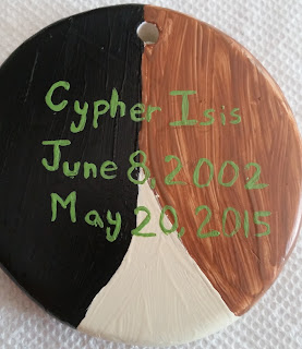 Before I left for my trip I made sure my cat's paw print was painted correctly. The colors match her coat and the green matches her eyes. This is the back of the print, the front is just white with the impression.